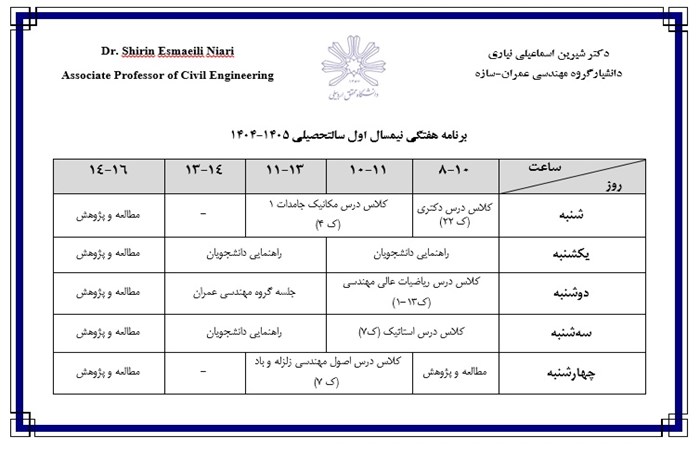 6 - Shirin Esmaeili Niari, Elham Ghandi, Parisa Samiee, Investigation of Buckling Behaviour of Cold- Formed Steel Columns with Built-up Sections Subjected to Fire, Journal of Structural and Construction Engineering, 8(7), 2021, pp. 255-276. DOI: 10.22065/jsce.2020.232335.2146. (In Persain) 5 - Elham Ghandi, Nayyer Mohammadi Rana, Shirin Esmaeili Niari, Numerical study of the behaviour of partially concrete- filled cold-formed steel columns, under simultaneous loading of static axial compressive load and axial impact loading, Journal of Structural and Construction Engineering, 8(8), 2021, pp. 310-329. DOI: 10.22065/jsce.2020.232284.2145. (In Persain) 4 - Sh. Esmaeili Niari, K. Abedi, E. Ghandi, Experimental Study of Steel Sheathed Cold-Formed Steel Shear Wall under Cyclic Lateral Loading, Journal of Structure and Steel, Volume 21, 2017. (In Persian). 3 - الهام هدایتی، شیرین اسماعیلی نیاری، الهام قندی، مطالعه آزمایشگاهی و عددی رفتار پس از آتشسوزی مقاطع فولادی با پوششهای ضد حریق، 10.22065/jsce.2025.532061.3765 2 - كمال غني زاده,وحيد اكرمي,شيرين اسماعيلي نياري,ناصرالدين شاهبازي, بررسي پارامتريك رفتار چرخه اي اتصال تير به ستون با ميراگرهاي فلز-الاستومر، سازه و فولادو 1403/5/22 ، دوره 19، شماره 44 1 - الهام قندي,شيرين اسماعيلي نياري,ندا حشمتي، شناسايي محل آسيب در سازه¬هاي فضاكار دولايه با تعداد اعضاي زياد با استفاده از پاسخ ديناميكي سازه و تئوري احتمالاتي بيزين، 25/9/1403،